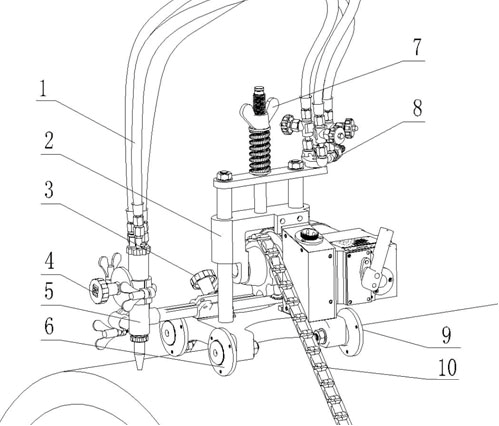 2.滑動之架 3.橫向進給旋鈕:改變割炬水平位置 4.割炬升降手輪:調(diào)節(jié)割炬高度。 5.割炬:切割厚度:5~50mm 6.滾輪:通過四只滾輪使機器在管壁平穩(wěn)運行 7.大翼形螺母:擰緊該旋鈕,將逐漸收緊鏈條,可使機器牢固的固定在管子上。 8.氣體分配器:可將氣體分為預熱氧、快氧、切割氧 9.離合器分離桿:可用于控制裝置運行。 10.主體部件 11.鏈條:裝置沿導軌方向隨鏈條傳動而運行 |