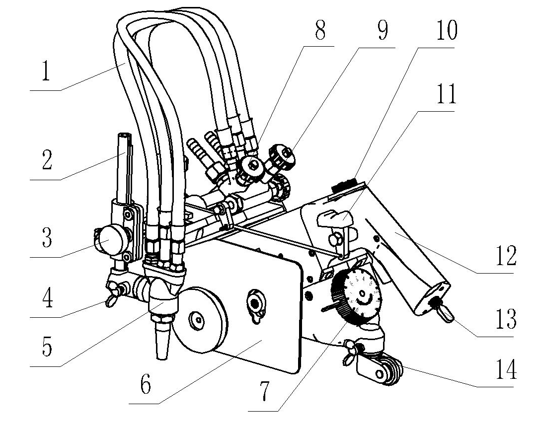 3.割炬升降手輪:旋轉(zhuǎn)手輪,可調(diào)節(jié)割炬與鋼板之間的垂直距離。 |