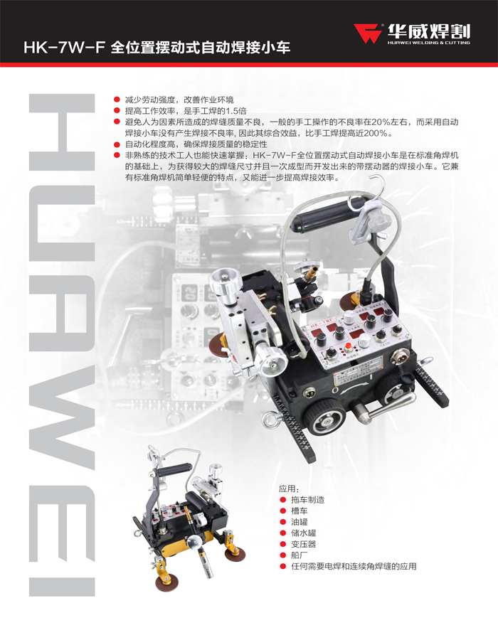 減少勞動強度,改善作業環境。提高工作效率,是手工焊的1.5倍。避免人為因素所造成的焊縫質量不良,一般的手工操作的不良率在20%左右,而采用自動焊接小車沒有產生焊接不良率, 因此其綜合效益,比手工焊提高近200%。自動化程度高,確保焊接質量的穩定性。非熟練的技術工人也能快速掌握:HK-7W-F全位置擺動式自動焊接小車是在標準角焊機的基礎上,為獲得較大的焊縫尺寸并且一次成型而開發出來的帶擺動器的焊接小車。它兼有標準角焊機簡單輕便的特點,又能進一步提高焊接效率。