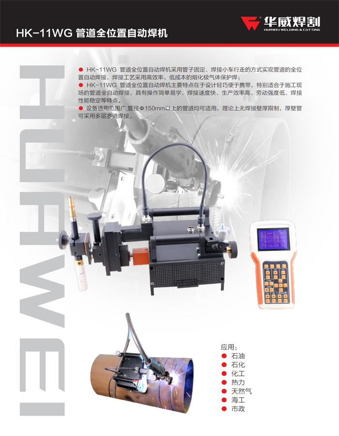 ● HK-11WG 管道全位置自動(dòng)焊機(jī)采用管子固定、焊接小車行走的方式實(shí)現(xiàn)管道的全位置自動(dòng)焊接,焊接工藝采用高效率、低成本的熔化極氣體保護(hù)焊;● HK-11WG 管道全位置自動(dòng)焊機(jī)主要特點(diǎn)在于設(shè)計(jì)輕巧便于攜帶,特別適合于施工現(xiàn)場(chǎng)的管道全自動(dòng)焊接,具有操作簡(jiǎn)單易學(xué)、焊接速度快、生產(chǎn)效率高、勞動(dòng)強(qiáng)度低、焊接性能穩(wěn)定等特點(diǎn)。● 設(shè)備適用范圍廣,管徑Φ150mm以上的管道均可適用,理論上無(wú)焊接壁厚限制,厚壁管可采用多層多道焊接。